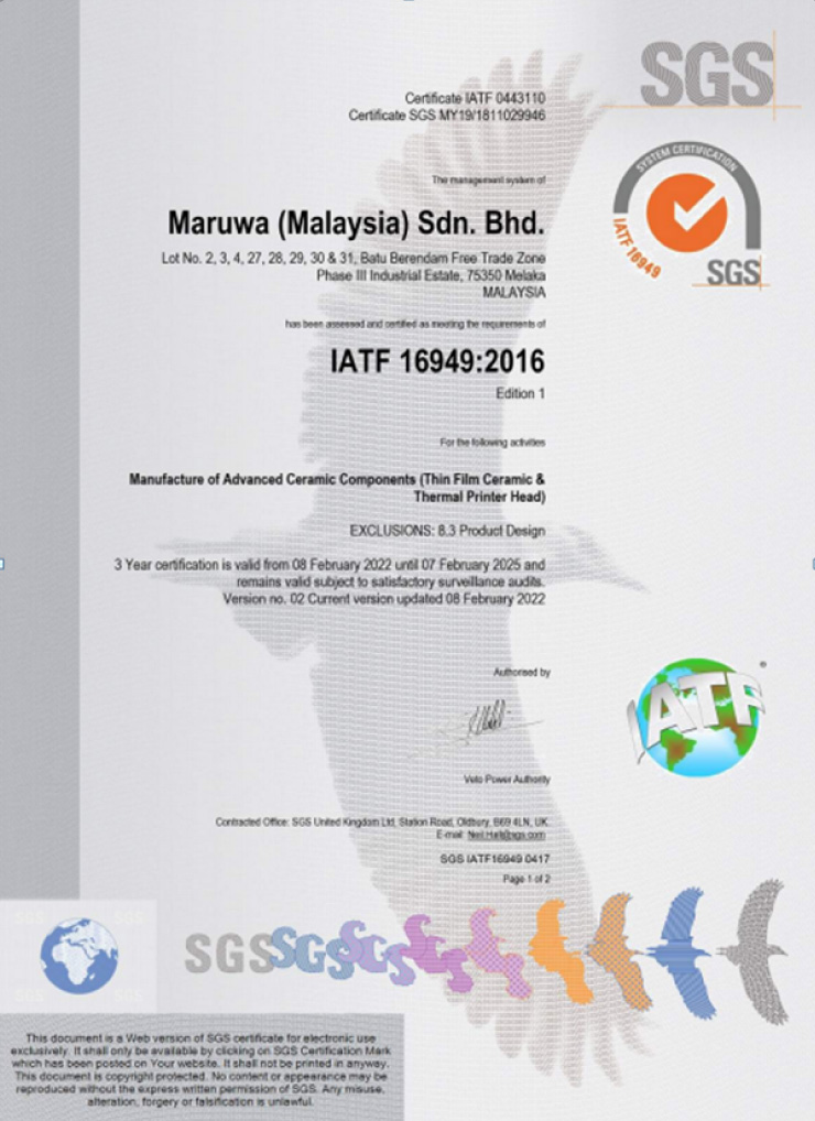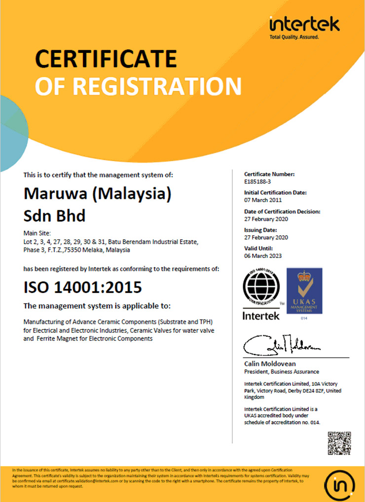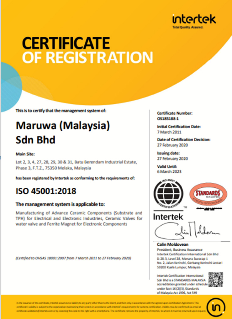 Maruwa (Malaysia) Sdn Bhd, a manufacturer of Advanced Ceramic Products, Ferrite Magnets, and subcontracting services, aims to be a leading global organization in protecting the Environment and the Safety and Health of our employees, visitors, contractors, and the public.