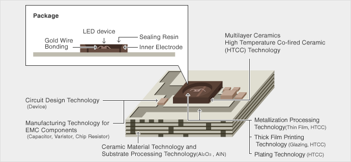We develop and manufacture LED modules that combine MARUWA's own components and technologies; such as ceramic substrate manufacturing, metallization, circuit design, mounting, and etc.